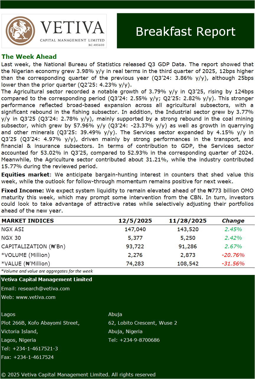 UncategorizedBreakfast Report – 08 December 2025 Posted on December 8, 2025December 8, 2025 by Vetiva Capital Download Report Vetiva Capital NIGERIA REBASED GROSS DOMESTIC PRODUCT (GDP) – Agriculture supports real GDP growth in Q3’25